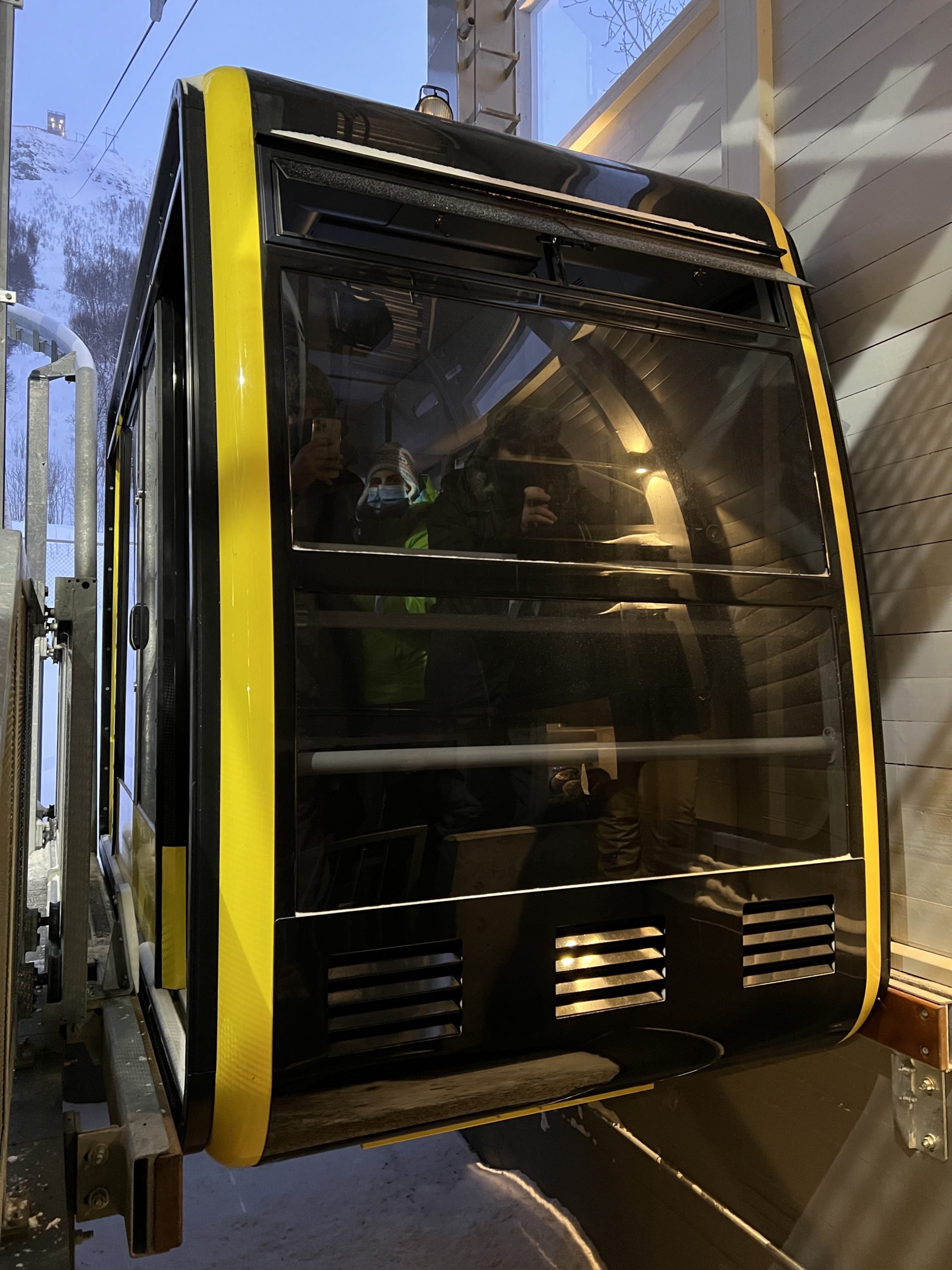The tram takes about 4 minutes and holds about 12 passengers. The lodge at the top has a café and a viewing platform with spectacular views of our ship and the city.